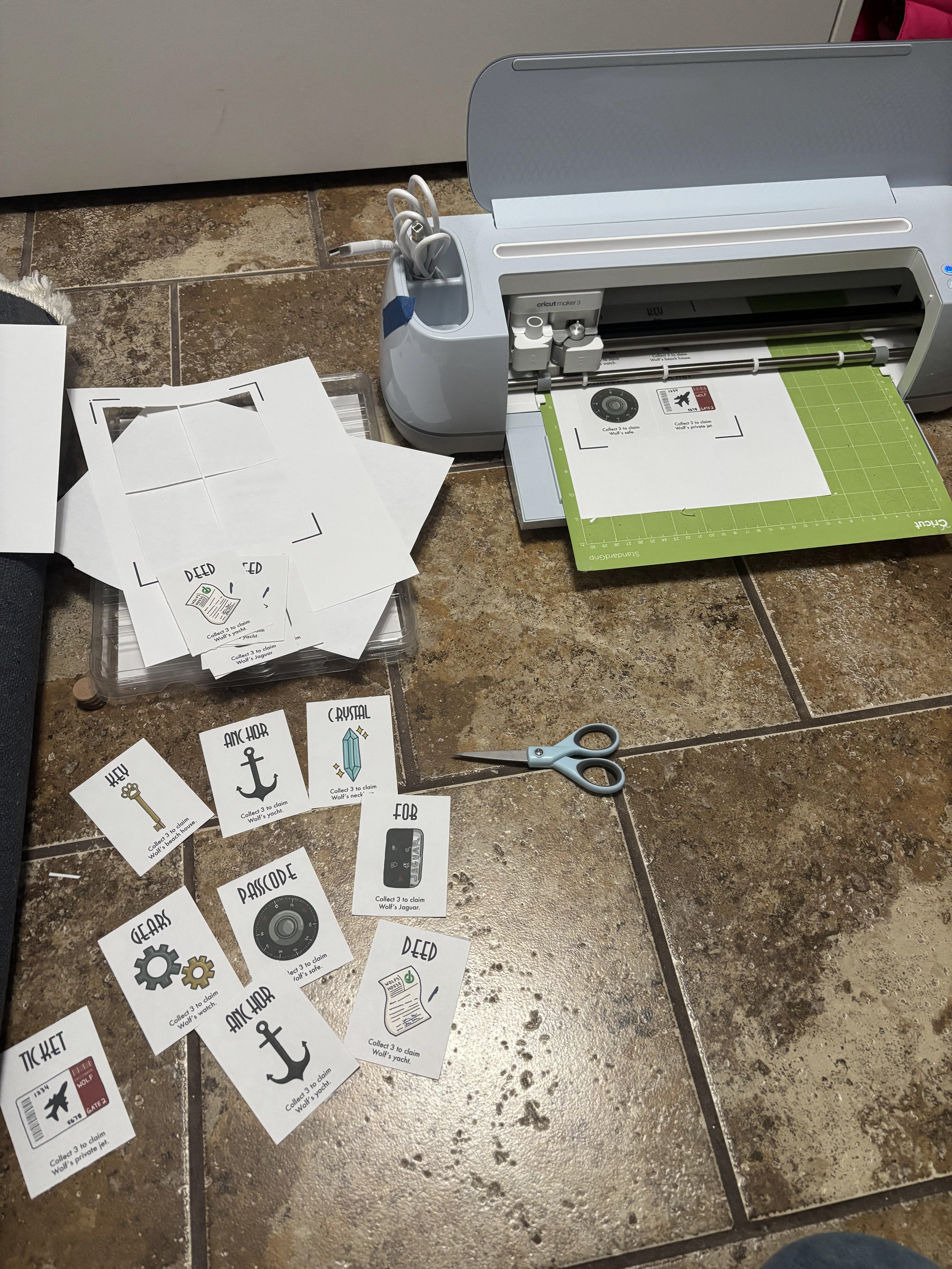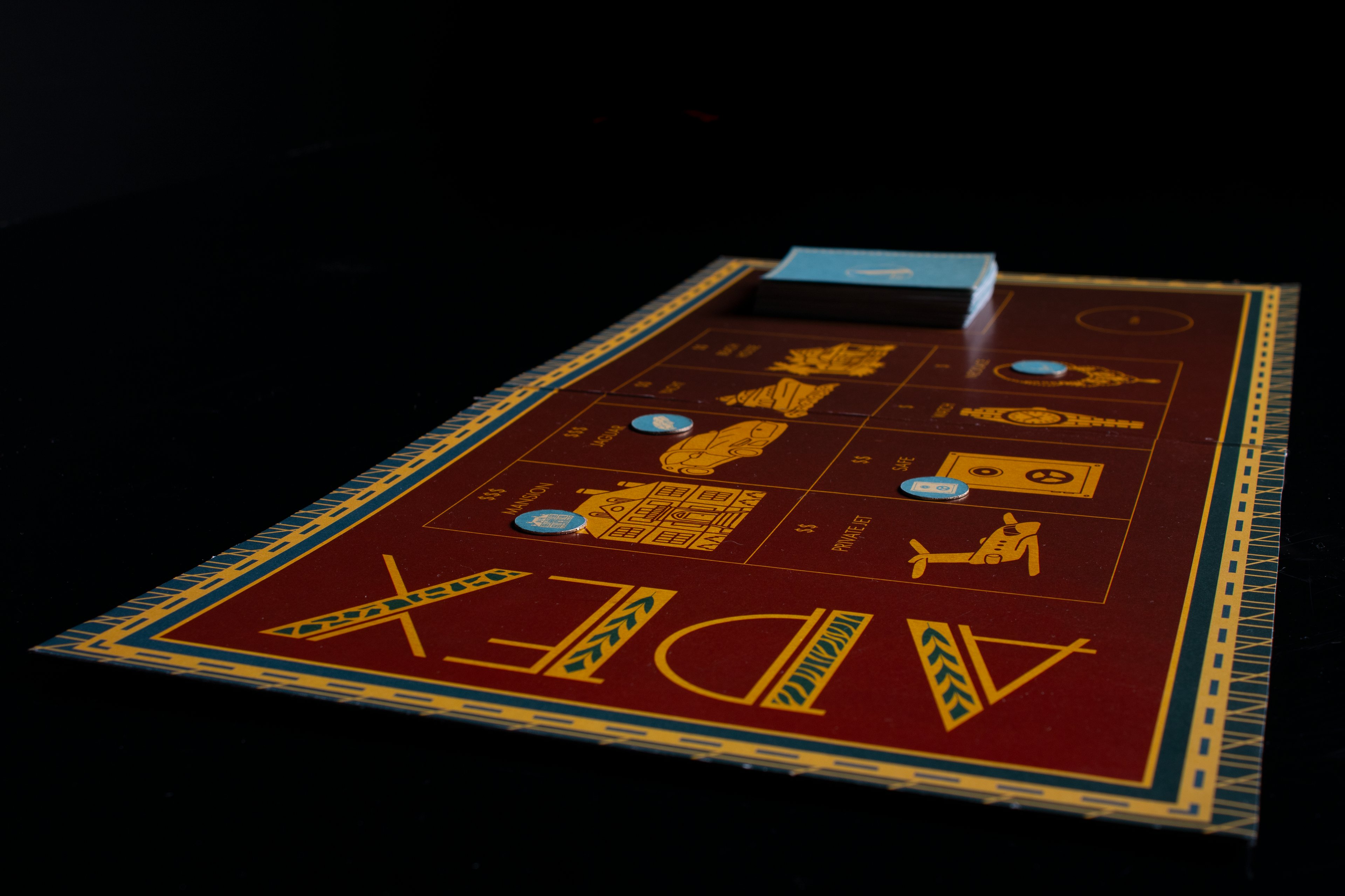While everyone had a hand in every aspect of the project, my main focus was the game mechanics and assembly. We repurposed a Monopoly box and glued our box assets to each side, allowing gold to peek through the edges. The item tokens were assembled with sticker paper on paperboard and the main token was made with sticker paper and bookboard. The cards were made with sticker paper put together.