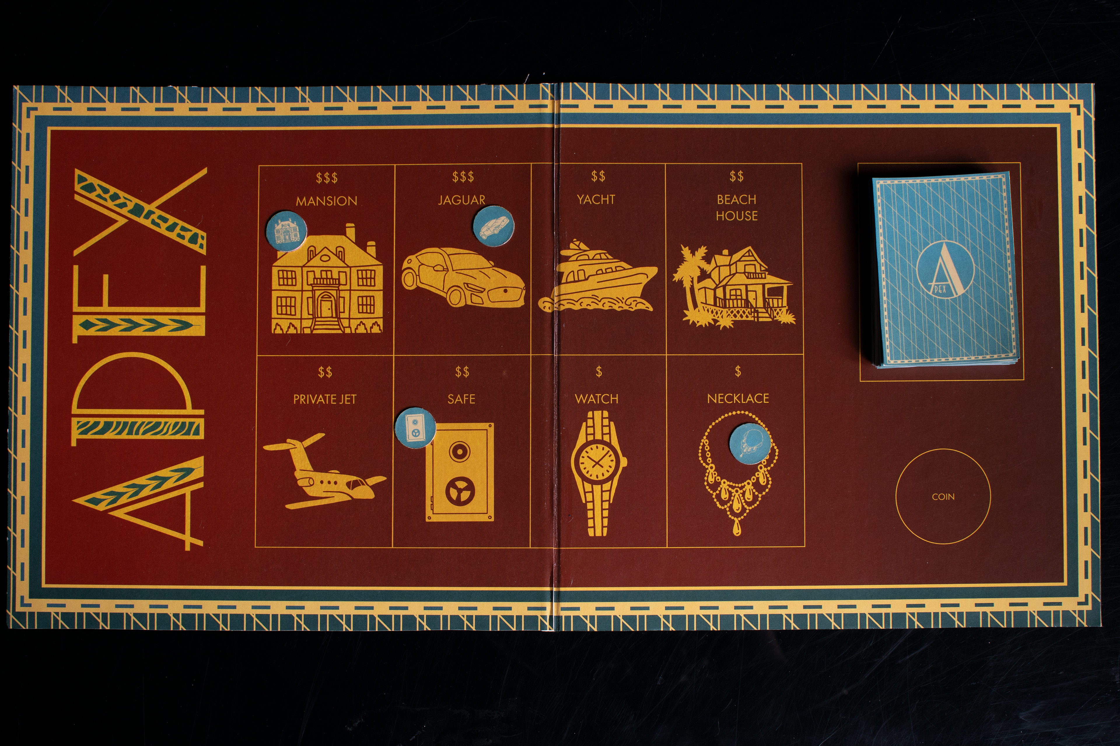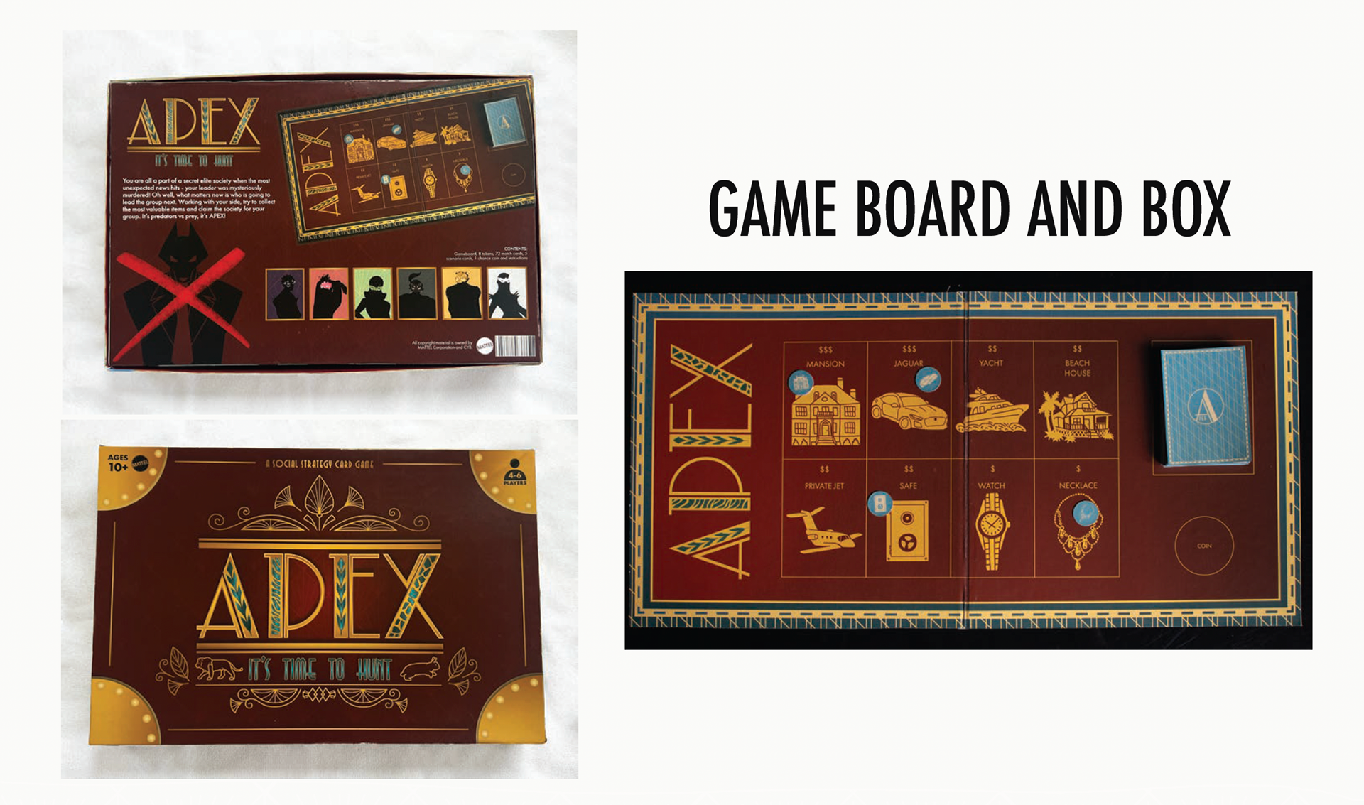 "APEX: Time to Hunt" is a card-based board game, where each player is trying to steal the assets of their late leader in order to take his position. Players take turns collecting item cards in order to exchange them for item tokens, while dealing with player-led conflicts along the way. The game ends when all tokens have been collected and whoever has the most wins!
